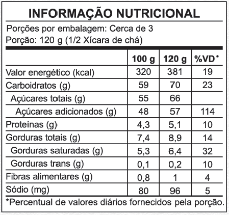 Ingredientes: Leite integral;Açúcar; Coco Ralado; Amido Modificado; Estabilizantes Pectina cítrica e Citrato de sódio; Conservador: Sorbato de potássio e Regulador de acidez Bicarbonato de sódio.